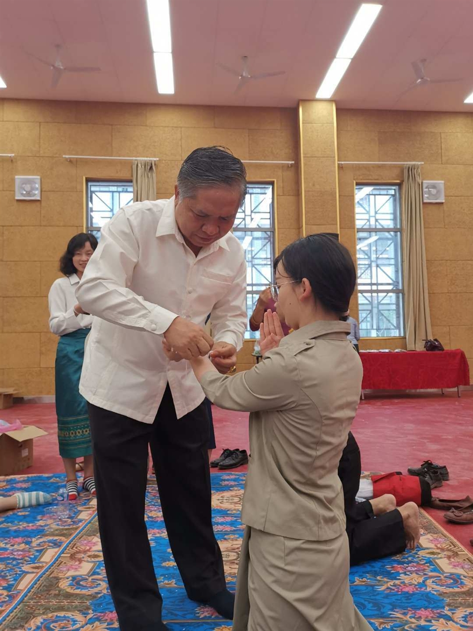 (老撾國立大學校長宋西.諾潘塞在給老師栓線祝福