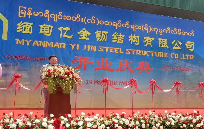 2018年仰光市,中國—東盟商務(wù)理事會執(zhí)行理事長許寧寧應(yīng)邀在緬甸億金鋼結(jié)構(gòu)公司開業(yè)盛典上致辭:中緬企業(yè)增進合作、共同發(fā)展。該公司是中緬合資,是緬甸最大的鋼結(jié)構(gòu)加工和安裝企業(yè),承建了包括緬甸國家體育館、曼德勒商務(wù)與會議中心等多個標志性建筑。