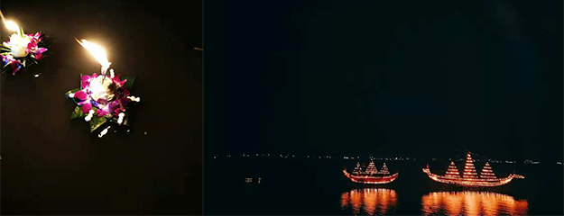 水燈是用象征著力量和財(cái)富的芭蕉葉折疊制成的,有的折成葵花狀,有的折成寶塔狀,折好的水燈上會(huì)插上鮮花和香燭,燃放爆竹之后,人們將香燭點(diǎn)燃,緩緩放入水中。剎那間,映著傾城月色,河面上燈火萬(wàn)點(diǎn),忽遠(yuǎn)忽近,隨波漂蕩,蔚為壯觀。