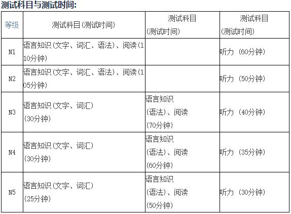 N1、N2考試分"語言知識(文字、詞匯、語法)、閱讀"和"聽力"2個科目;